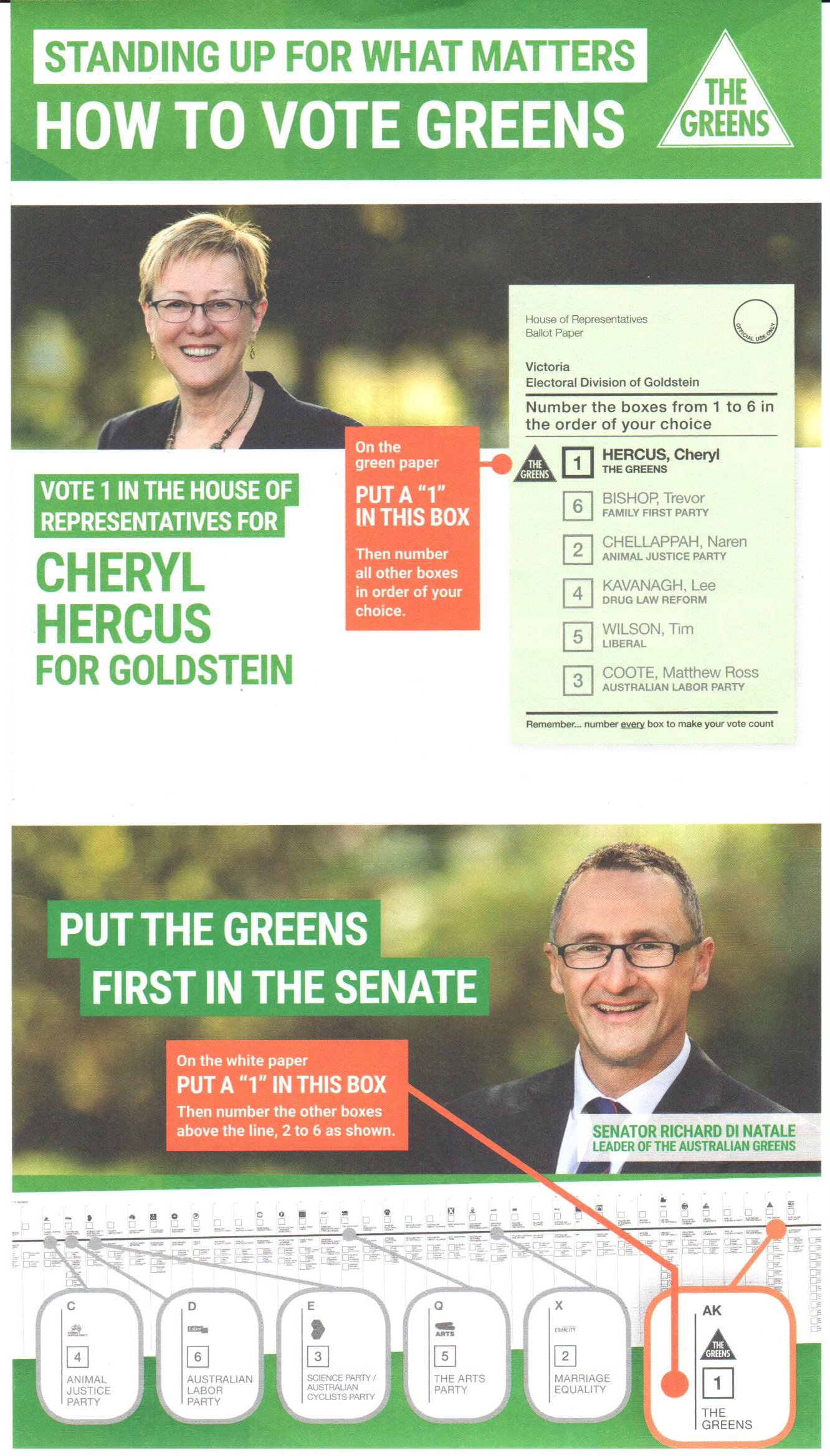The Greens' 2016 how-to-vote cards gives the impression that its Senate candidates are not worth naming. Unlike the Greens' better cards at the 2010 election, where at least the leading candidate was named, the card ignores - and thus potentially offends - intending below-the-line voters, who obviously consider that to be a better way to have their effect on the outcome. No reason, or apology, is given for offending those voters, whose votes could have helped the Greens. The Greens won fewer Senate places in 2016 than they had held earlier. |