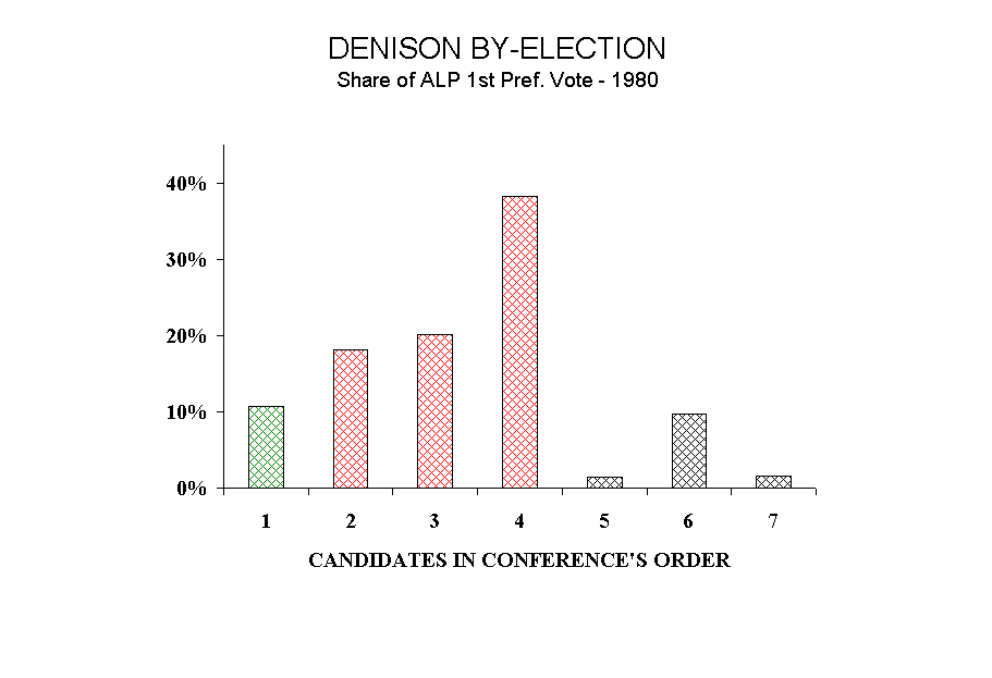 The PRSA has sent a submission to the Tasmanian Branch of the ALP following a resolution at a recent State Conference (See QN59) that referred a move to oppose Robson Rotation for report by the Party's Legal & Constitutional Committee. The PRSA was advised to address its letter to the Secretary of that Committee, Mr . Our case instanced the 1980 Denison By-election, which was the first time Robson Rotation was used, as an object lesson. The Tasmanian ALP decided for that election to issue a how-to-vote card for the Assembly, and thus became the first major party to do so. The 65 State Conference delegates decided the order on it, but Robson Rotation, which ensured that there was a randomized order of candidates' names in each party column on the ballot-paper, ensured that those voters that deliberately exercised a choice from among the candidates decided which would be elected. Details were: