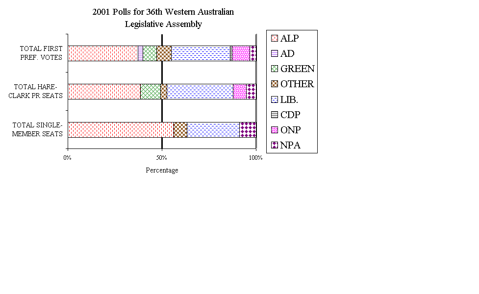Graph: Click on the graph of the various parties' percentage of the vote, which illustrates the statement above. With Hare-Clark casual vacancies filled by countback of general election ballot-papers, as for the Tasmanian and ACT Assemblies, the predictable party continuity lets Governments last full term. Details of the 13 Multi-member PR Districts: Click on details to see the PR districts, the votes in each, and the seats that would be won with that arrangement, compared with the single-member seats actually won. The single-member system reveals that in 45 of the 57 single-member districts an absolute majority of voters cast their first preference vote for a candidate other than the candidate that was elected. The Liberals and the Nationals gained only one seat each, Cottesloe and Merredin respectively, that was won with an absolute majority of first preference votes. This election shows that the diversity of views of the electorate would have been more faithfully represented, and less distorted, if a Hare-Clark multi-member PR electoral system had been used instead of single-member electoral districts. The analysis shows that the highest-polling party, the ALP, won an absolute majority of votes in multi-member PR district No. 4 only. Under Hare-Clark PR in Tasmania a party has often won a majority of votes in one or more of that State's five multi-member districts, but only once has a Tasmanian MHA (Douglas Lowe in 1979) received an absolute majority of first preference votes, because the diversity of candidates and their support has nearly always let voters express their diverse views with a real chance of their being represented. There is no restrictive "winner-take-all" scheme operating for the Lower House of either Tasmania or the Australian Capital Territory, as there is in all the other Lower Houses in Australia, which still continue to be elected from single-member electorates. |