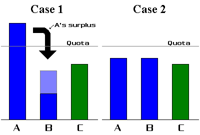 At first this may seem like deliberate manipulation of the system, but it should be stressed that this equalisation of votes benefits the larger parties only when the last seat at stake is doubtful and has to be decided on preferences, and only when the average vote of the major party's remaining candidates (here A and B) is greater than that of their minor-party rival. When a party has a quota of votes in its own right, equalisation of its opponents' votes cannot deny it a seat. Here C did not have a quota in his/her own right, so it was possible that B was entitled to the seat ahead of C.