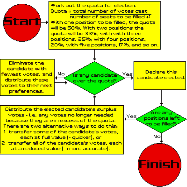 [Note that where only one position is to be filled, this reduces to the familiar majority-preferential system, with a "quota" of 50%. The distribution of preferences if no candidate has a "quota" (in this case a majority) still applies, but the distribution of surpluses becomes irrelevant.]