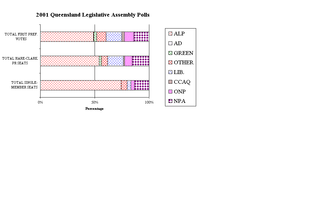 This unjust imbalance would not apply under a Hare-Clark proportional representation electoral system. It would have produced a majority ALP Government, with 53.9% of the seats, and the Liberals would have gained 14.6% and the Nationals 15.7% of the Hare-Clark PR seats. Such a Government would have been quite stable, as vacancies due to death or resignation are filled by a countback of the ballot-papers from a Hare-Clark general election. Countback would have saved the cost and 3-month delay of a Surfers Paradise by-election poll, yet let voters decide a prompt, fair replacement for Opposition Leader Rob Borbidge who, on election night, said he would resign that seat he had just won. Graph: Click on a graph of the various parties' percentage of the vote, which illustrates the statements above. Details of the 11 Multi-member PR Districts: Click on details to see the PR districts, the votes in each, and the seats possibly won. The ALP vote was particularly concentrated in the innermost suburbs of Brisbane. In the three 9-member Hare-Clark multi-member districts suggested closest to central Brisbane, which make up over 30% of the Parliament, the ALP's 57.7% of the first preference vote won it 100% of the seats. The PRSA’s Hare-Clark analysis showed that this large and diverse area of Queensland’s capital city, in which 42.3% of voters gave their first preference vote to a non-ALP candidate, would have elected 17 ALP members (surely enough to make the point of the ALP Government’s dominance), 7 Liberals, 1 Green, 1 National, and 1 Independent MLA. Instead, the ALP won all those 27 contiguous districts. Of the 89 seats overall, only 79 seats had more than 2 candidates, and 42 were won without an absolute majority of first preference votes, i.e. an absolute majority of voters in each of those 42 seats voted for candidates other than the candidate elected. Click on the distribution of candidates per seat to observe the restricted choice offered to voters, where in nearly two-thirds of cases there were four or fewer candidates per electoral district. Only 52 of the 89 seats available attracted more than 3 candidates. In contrast, even the smallest envisaged multi-member Hare-Clark district had 9 candidates. |
