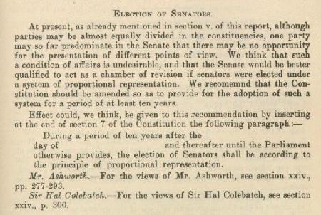 The 1929 Royal Commission on the Constitution [5], whose members were appointed on the advice of S.M.Bruce's Nationalist Government, recommended inclusion of PR in the Constitution, but that was not implemented. The Proportional Representation Society of Victoria held a Melbourne Town Hall meeting in 1943, which resolved to press the Prime Minister, Rt. Hon. John Curtin MHR, to introduce PR for the Senate. Copies of that Society's letter to the Prime Minister and the reply are attached. A 1948 Hansard [6] records the Attorney-General, Rt. Hon. H.V. Evatt KC, introducing his Bill that amended the Commonwealth Electoral Act 1918 to provide for PR for the Senate, and acknowledging the help of ‘the Proportional Representation Society of England’. A 1948 letter from the Proportional Representation Society of Victoria congratulated the Prime Minister, Rt. Hon. J. B. Chifley, on the Bill that introduced PR. Since then, the PRSA has monitored the Senate system - the world's largest scale quota-preferential PR election. PR is the longest operating electoral system used for Senate elections. The PRSA has monitored other Australian elections also. Regrettably there is no constitutional or other entrenchment requiring approval at a referendum, or even an absolute majority vote in both houses of Parliament, before the Senate's PR system can be weakened or abolished. 3. Casual Vacancies Setback: Senator Peter Rae, and some other Tasmanian Liberal senators that had a good understanding of the Hare-Clark system and its countback procedure for filling casual vacancies in a PR system, agreed with the PRSA that the Constitution Alteration (Senate Casual Vacancies) Bill 1977, in ostensibly seeking to modify the original form of Section 15 of the Constitution, which provided for the filling of Senate casual vacancies, to make it consistent with the PR system used since 1949, should have used countback, rather than the system of nomination on a party basis that replaced that original 1901 provision. They advocated that replacement senators should be elected by the people via countback, and not, as proposed in the Bill, by the Constitution requiring State Parliaments to endorse the nominees of political parties, during the debate on the Bill. Countback would have ensured direct election of all replacement senators, but those senators' advocacy failed to change the Bill, so senators filling casual vacancies since 1977 have been, regrettably, indirectly elected since approval of the Bill at a 1977 referendum produced an alteration resulting in the present form of Section 15 of the Constitution. From the adoption of the original Constitution until that change in 1977, Section 15 had simply prescribed that casual vacancies had to be filled, until the next periodic or general federal election, by a person appointed as the relevant State Parliament, or until it sat, the State Governor, saw fit. Since then senators directly elected by the people, such as Senator Michael Tate (ALP, TAS) and Senator John Herron (Liberal, QLD), have resigned after serving only a month or so of their 6-year term, and their places have been filled for nearly 6 years by persons unelected by the people. The looseness of the present form of Section 15 of the Constitution has allowed other anomalies such as: